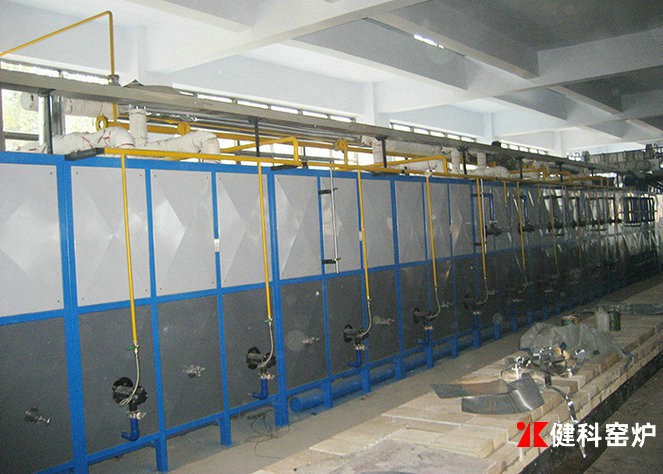 燃料燃燒系統:包括燃料輸送管道、燃料預熱、燃燒器等。隧道窯的加熱燃燒主要是重油,輕柴油,和天然氣煤氣,原有的直燃煤方式已不多用。油類燃燒配備有儲油罐和燃燒噴嘴。因油類成本較高使用較多的仍是天然氣和煤氣,天然氣是通過天然氣管道將天然氣輸送至窯爐有專門的天然氣燒嘴進行噴射燃燒。煤氣燃燒除了有專一的煤氣管道輸送至爐窯外,隧道窯用戶大都自備有煤氣發生爐進行煤氣的生產,由煤氣發生爐所產的煤氣經過管道輸送至隧道窯燃燒室,通過煤氣燒嘴進行噴射燃燒。